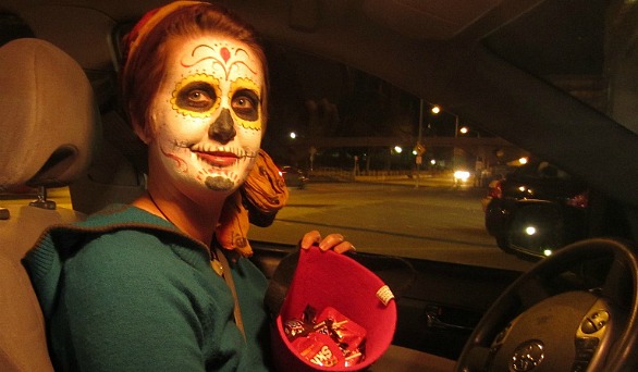 I’m riding shotgun with Becky Wheeler, an eight-year veteran of Union Cab, on one of the busiest nights of the cabbie’s year. Saturday is a collision of parties with UW’s Homecoming, including a football game, and Freakfest with its 33,000 ticket holders converging on State Street along with costume parties and nightclub celebrations taking place all over town. Becky’s in costume, with elaborate sugar-skull face paint, and is offering candy to passengers…